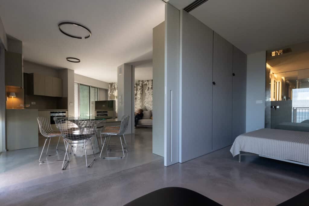 Il primo appartamento, originariamente progettato come open space con letto a scomparsa, ospita oggi la zona giorno, mentre il secondo accoglie la nuova zona notte, creando una distribuzione funzionale e armoniosa degli ambienti.