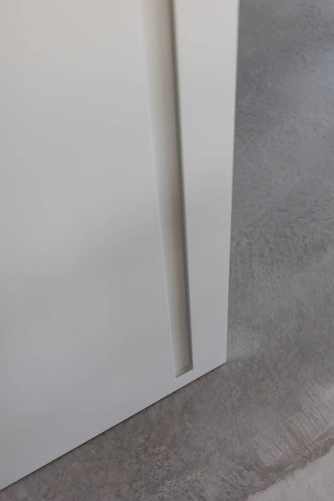 - Portoncino d’ingresso rasomuro Project Oikos, con interno laccato a campione in perfetta continuità con le pareti, per un effetto minimale ed elegante.