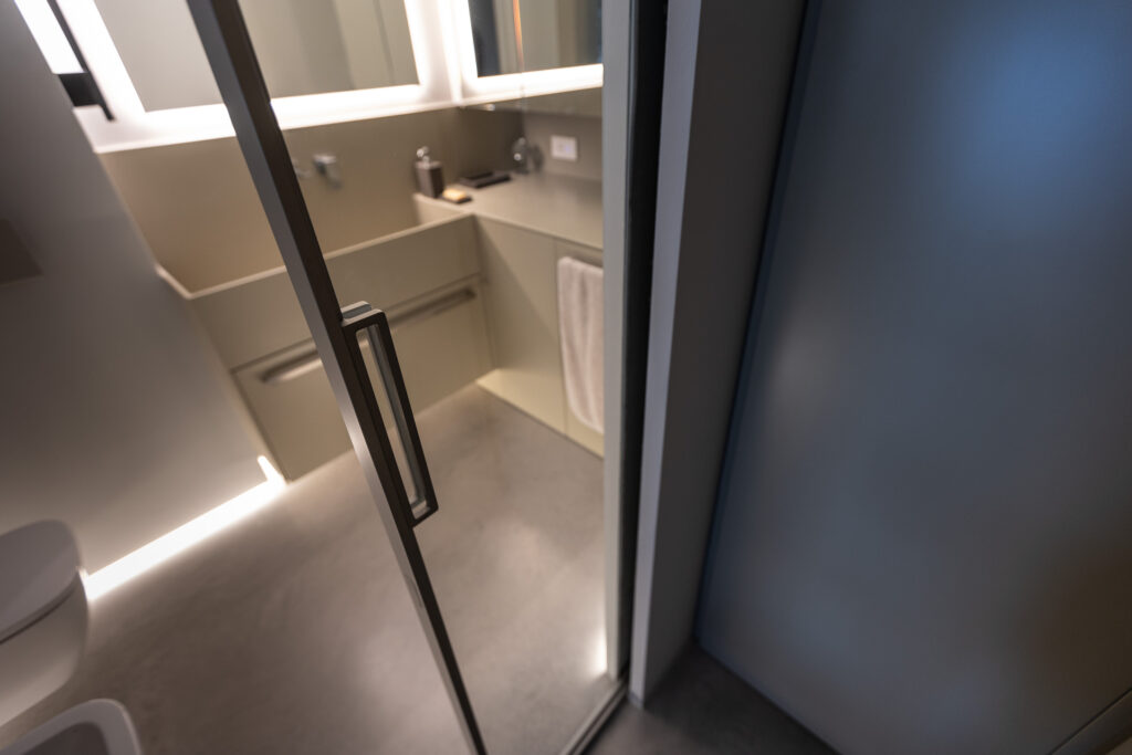 - Porta scorrevole entro muro Rimadesio Velaria con vetro riflettente anche nel bagno della zona notte, coordinata con le altre finiture del progetto.
