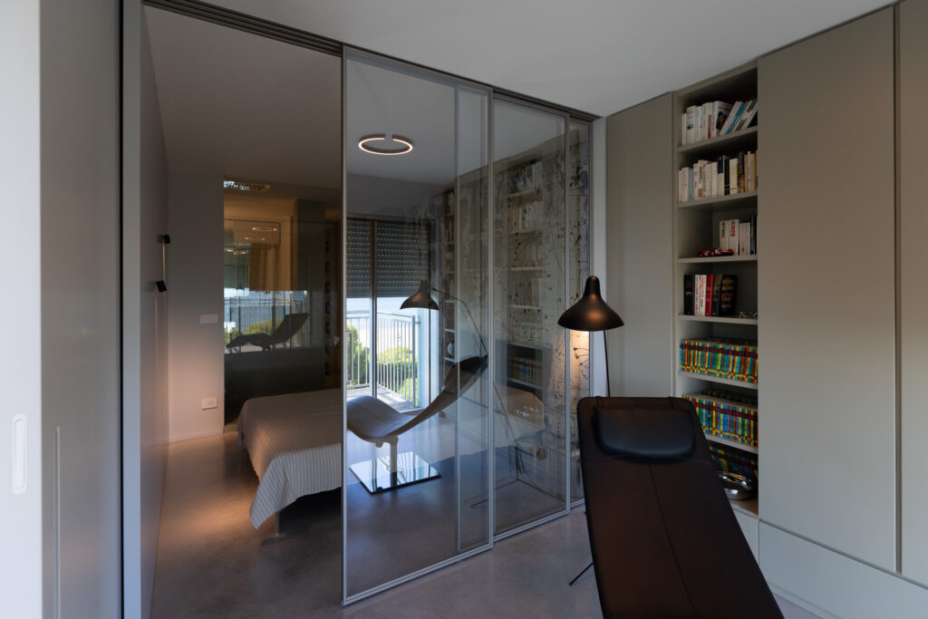 - Porte scorrevoli esterno muro Rimadesio Velaria in vetro riflettente con struttura platino, inserite per dividere la zona lettura e relax dalla camera da letto.
