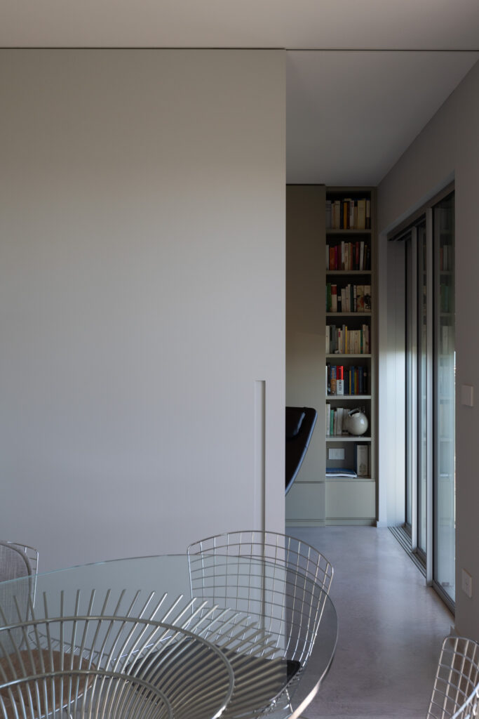 - Porta scorrevole esterno muro Lualdi Sliding50, laccata a campione e composta da doppio pannello per raggiungere i 240 cm di larghezza, utilizzata per separare la zona giorno dalla zona notte, segnando simbolicamente il passaggio tra la parte originaria e l’ampliamento dell’abitazione.